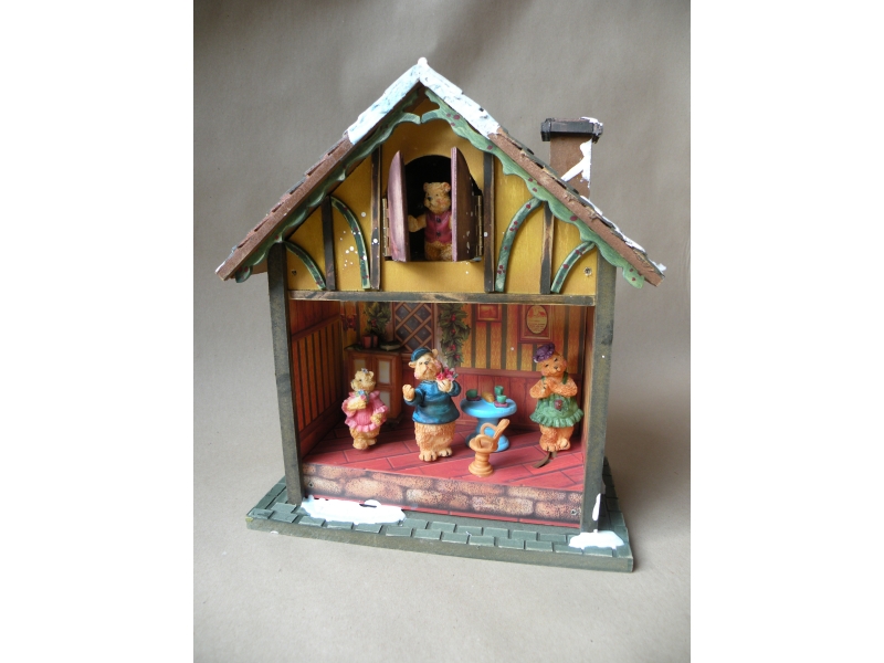 Gli orsetti si muovono e la finestrella si apre al suonodi una musica. Misura cm.28 circa in altezza.