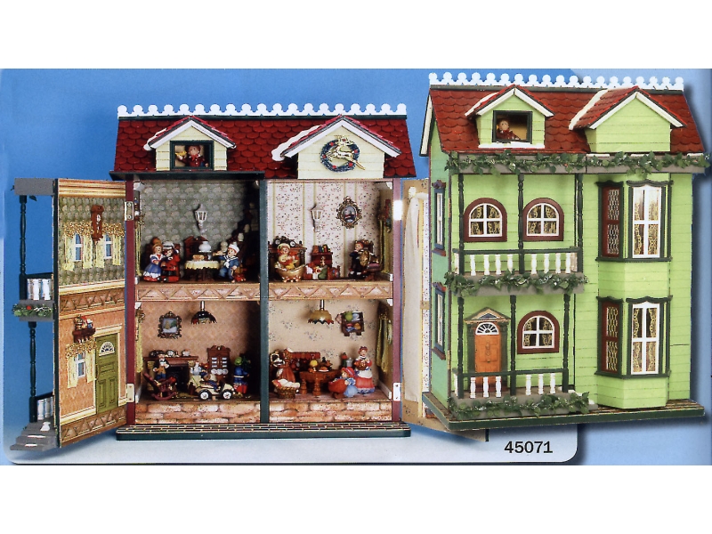 Casa in legno altezza 43 cm. All'apertura delle porte gli interni si illuminano e le figure orsetti si muovono o girano al suono di una musica. Batterie per illuminazione.